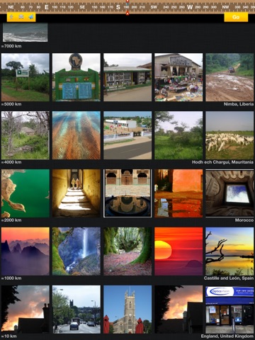 In Whats There? select any direction and press Go to view photos of places located near you in that direction and then farther and farther away, right to the other side of the Earth!
