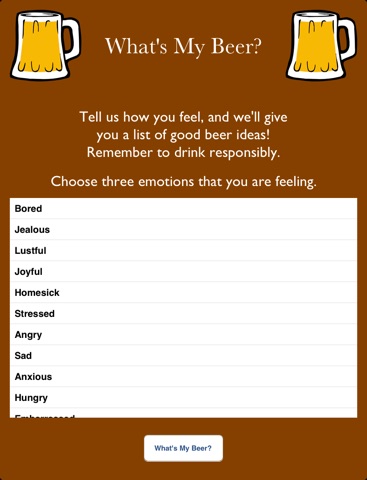 Whats Your Beer? Tell us how you feel, and well give you a list of good beer ideas! Remember to drink responsibly.