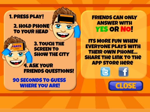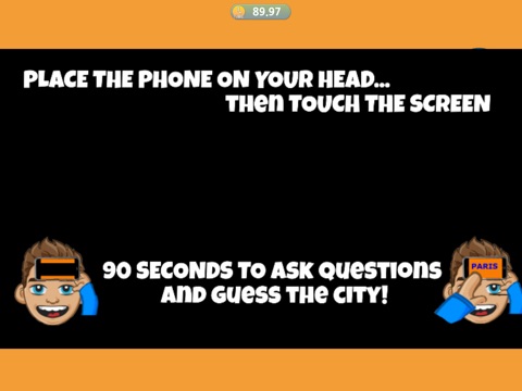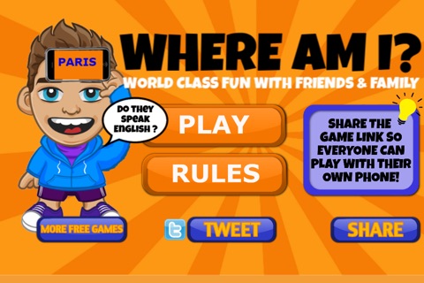Great fun with friends or family with this awesomely simple CITY guessing game. Test your geography skills and guess where you are with a little help from your friends! To play just press PLAY and put your phone to your forehead to display the city name for all your friends to see. Youve got 90 seconds to ask questions about where you are and guess the correct city! Sounds easy...but as the clock ticks down the pressure rises...so let the fun begin...install Where Am I? FREE now!