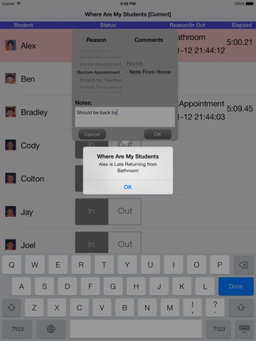 Enter your student names and optional photos; your own categories (Bathroom, Principal, Gifted Programs, etc.); make notes on the fly and setup your own timers and alarms. The App. is very user friendly and easy to customize.