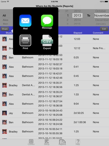 A complete reporting system will show how often Mary was in the Girl’s Room in October; Johnny was on family vacations; or Herb was at the nurse’s office. Print, E-Mail or Text Message the reports . . . even export them to spread sheets.