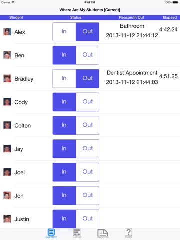 Whenever a student is checked out of the room, a handy on-screen timer appears next to that student’s name. This is a huge help to teachers of all levels, elementary through high school, who want to track not only who is out of the room and where they are, but for how long they have been gone.