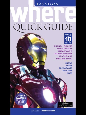 Where Las Vegas is the ultimate guide to the excitement and glamour behind the Las Vegas Strip. On any given night, more than 100 shows perform on Las Vegas Boulevard, and the worlds most revered chefs, such as Charlie Palmer, Pierre Gagnaire, Guy Savoy, Emeril Lagasse, Alain Ducasse and Joel Robuchon, are represented here. Fashionistas will find boutiques from top brands and designers, and adrenaline junkies will discover thrills aplenty. Nowhere else could you find so much to do in a mere four miles, and Where Las Vegas is here to help you uncover the best of the best. Every issue comes loaded with the Where® Guide, a quick-reference compilation of editor’s picks on the hottest new shows, restaurants and nightclubs, activities and tours to take, shopping destinations and more. Where® is the world’s premier name in travel publishing. From magazines and books to maps and comprehensive digital content, Where gives travelers everything they need from a local perspective. Each year, millions of travelers trust Where for up-to-date information on where to go and what to see in more than 100 cities worldwide. Dynamic content created by local editors covers essential dining, shopping, attractions, entertainment options and more, all from an insider’s point of view. For more in-destination information and for travel ideas around the globe, head to www.wheretraveler.com .