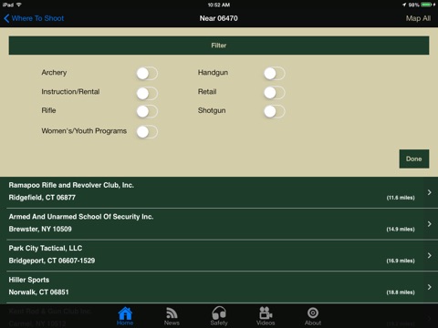 Search for shooting ranges near you, view video shooting tips and find other resources for shooters. Managed by the National Shooting Sports Foundation (NSSF), Where To Shoot is the webs most comprehensive directory of shooting ranges in the U.S. and Canada. This app brings that directory into the palm of your hand. A great resource for all gun owners, hunters and shooters.