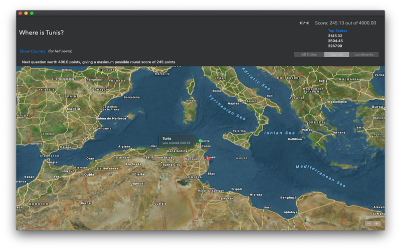 If you are struggling, you can request the country (for cities) or name (for landmarks) which then reduces the possible points by a half.