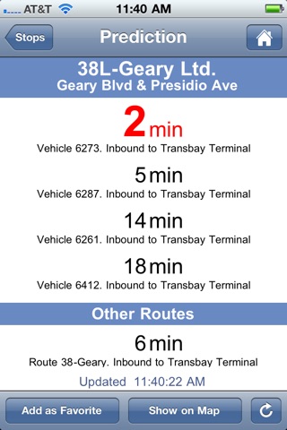 This app relies on MUNIs partner, NextBus, which releases information, including real-time GPS locations and arrival countdown information, for all bus routes. This App is compatible with the iPhone and iPod Touch, but it requires an Internet connection (3G or WiFi) to get access to NextBus, who actually provides the real-time data.