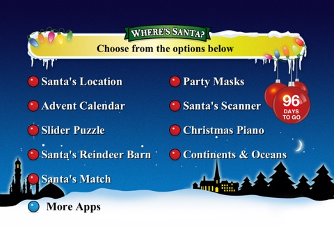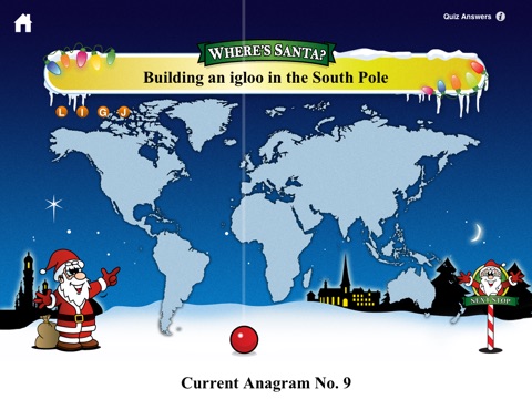 Follow Santa on his travels around the world. Find out where HE HE HE is today. An animated marker is displayed pinpointing Santas location and a descriptive message letting you know what he is doing. At every location Santa visits he drops off a new letter at the top of the screen, see if you can work out the anagrams.