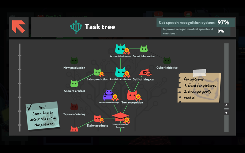 In this game, you play as a coder who accidentally found out that their cat is extremely good at coding, but not as good at speaking human language. Now this coder (it’s you!) must learn all there is to know about machine learning and use visual programming to build a cat-to-human speech recognition system.