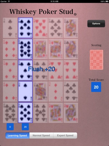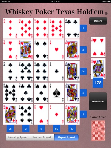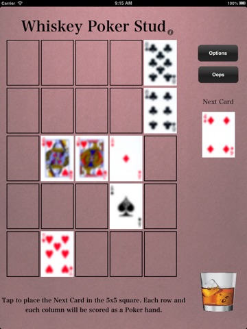 In WHISKEY POKER OMAHA HOLDEM you place your cards in a 5x5 grid or four common "hand" cards. EXACTLY THREE cards from each row and column, together with EXACTLY TWO common "hand" cards, is scored as a Omaha Holdem poker hand. Omaha Holdem is only available on the iPad.