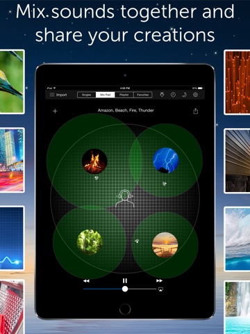 This is a great app for falling asleep to or even just to tune out more aggravating ambient noise on an airplane. I rather like the mixing feature and have made several mixes already. One slight problem is that occassionally a sound will "stick" and persist even in the presence of other sounds. Hopefully this will be fixed in the next version of the app.