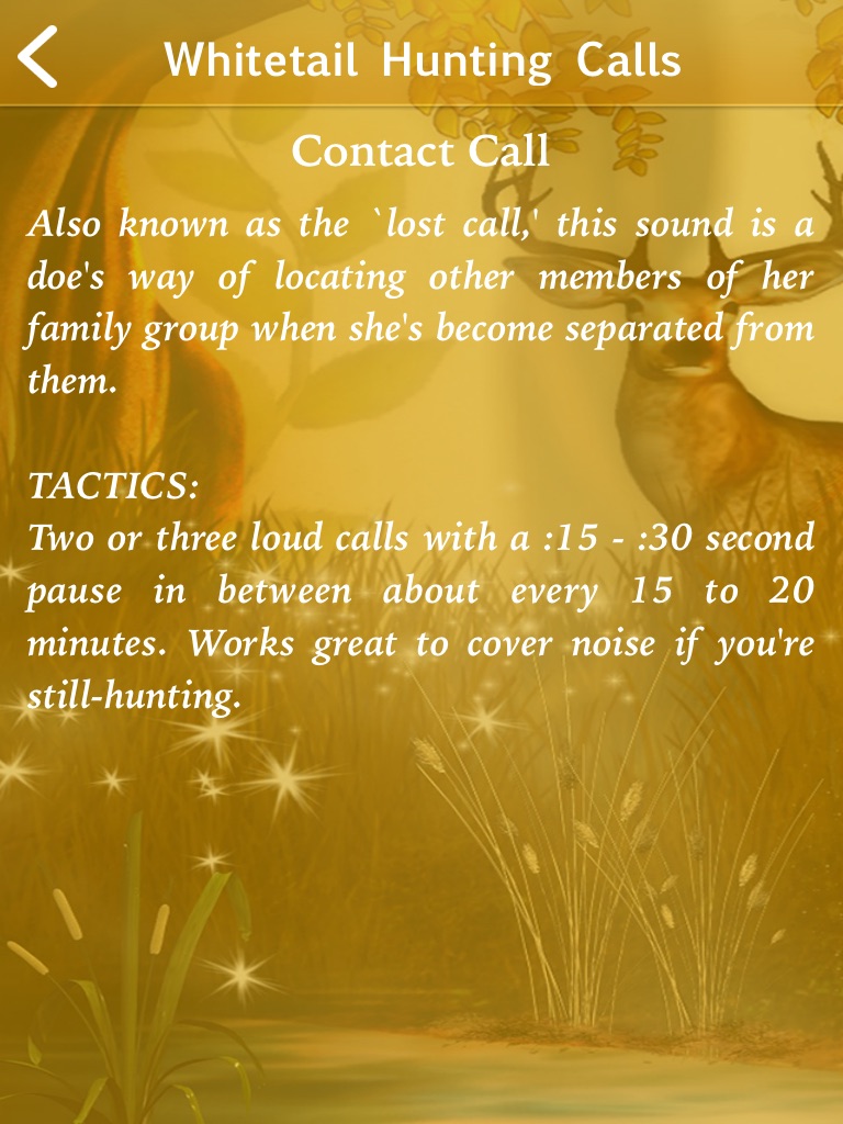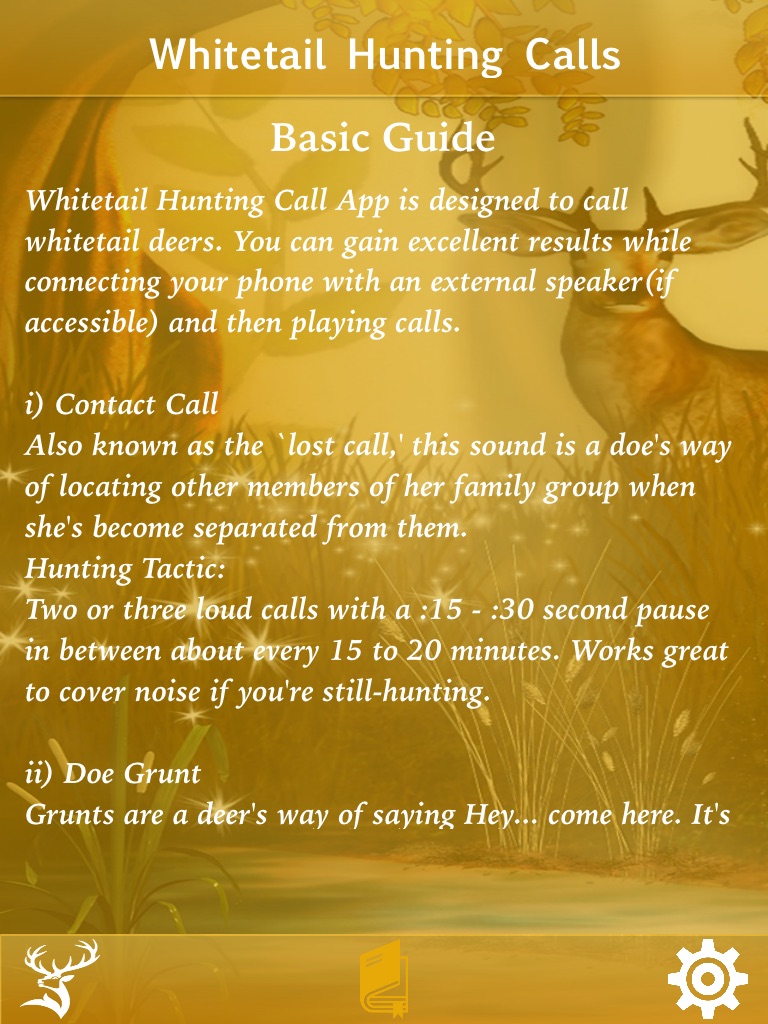 This app includes 10 calls for whitetail deers with instructions. The instructions allow you to read the description of every call and appropriate situation for using specific a call.This app is specially designed keeping hunters in minds having clear and big play, stop or change calls buttons for easy accessibility during difficult terrains.
