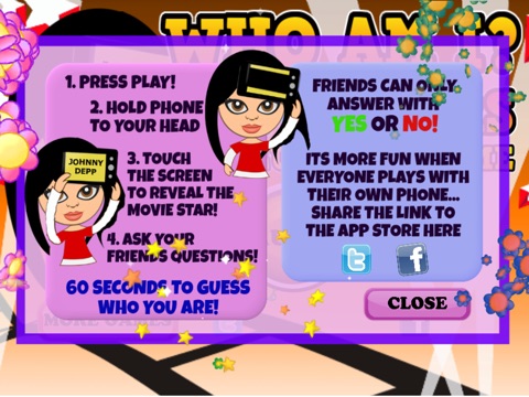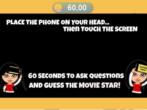 Just press PLAY to start, put your phone to your head and ask questions to guess which Hollywood star you are! Friends can only answer YES or No and you have 60 seconds to guess the who you are!