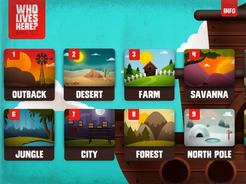 * 10 unique locations including a farm, the African savannah, the ocean, a jungle, the city, a forest, the north pole, river, australian outback and desert