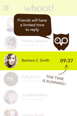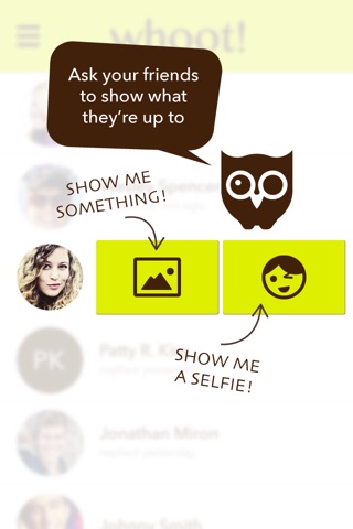 Whoot is about asking your friends to show you what they are up to. When you ask to see, they have a limited time to reply using their phone camera. It simply takes only one quick tap to send a realtime photo or video back to you. Also, everything friends show you is gone right after you see it. It’s that easy!