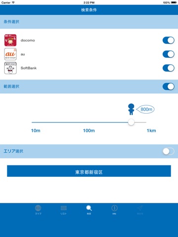 3) 10mから1kmのあいだで、検索・表示範囲を設定できます。