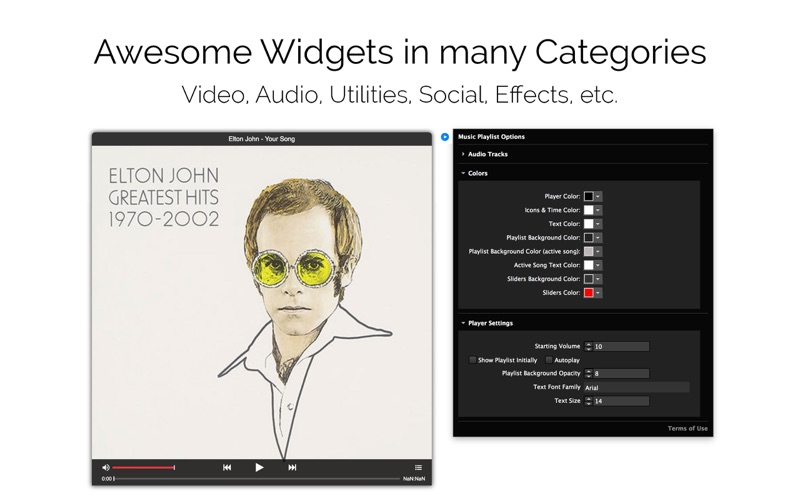 The collection of widgets includes customizable video and audio players, various widgets for text and image effects, photo sliders, social networks widgets and many more. Please visit our website to see the full list of widgets and to preview them.