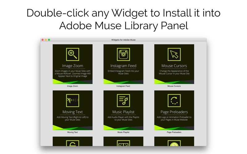 To use any widget, just double-click it in the app and it will automatically install into Adobe Muse Library Panel. Then, drag a widget from the Library Panel in Muse onto your website. It is that easy! You will be able to adjust widgets according to your preferences by selecting various options in the widget menu. So it is super easy to beautifully incorporate any widget into your website design.