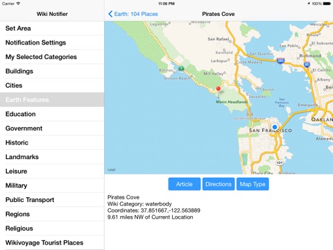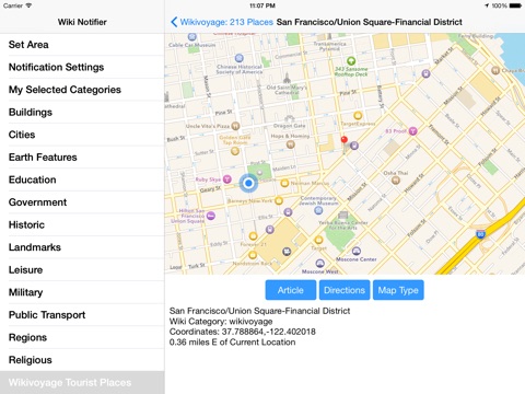 Wiki Notifier has over 550,000 worldwide Wikipedia/Wikivoyage geocoded places in its database. You can browse wiki places around your current location or around a selected location. You can also be notified when you are in range (proximity) of any place that is of the type specified by your selected place categories.