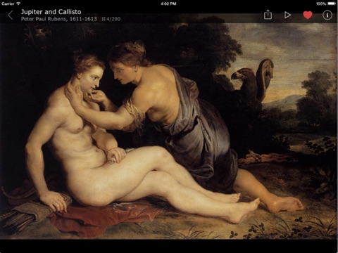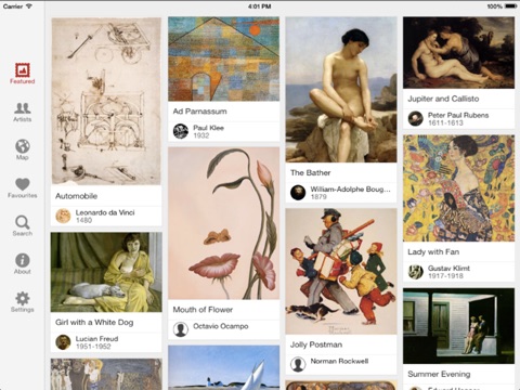 Cette application est extraordinaire : elle est non seulement gratuite mais dune grande qualité. Chaque fois que cela est possible les œuvres sont présentées avec une bonne définition et dans un format correct, et non comme des timbres poste, de plus il est possible dexpédier limage présentée par mail. Enfin des centaines dartistes et des milliers de tableaux sont exposés avec le nom de lauteur, le titre (en anglais), et la date. Enfin il est possible de contribuer comme avec Wikipedia. Rien que pour un peintre comme Cézanne je navais jamais vu autant de travaux exposés. Cette application démode définitivement toutes les autres qui sont souvent faussement gratuites, et de moins bonne qualité. Je recommande sans réserve.