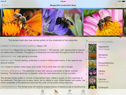 Detailed native bee and plant profile pages introduce the user to many of our "garden variety" native bees and their favorite flowers. The profiles also feature bi-directional links for key bee and plant partnerships to assist gardeners in making the best bee-friendly plant selections.