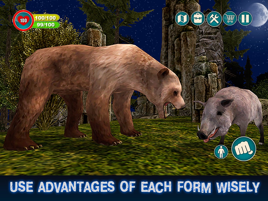 Mind your shaman indicators - health, energy, and fullness. Never let one of these drops – it will let you no chance to survive! Find or craft special survival tools – weapons, axes, fishing rods or just sticks to making campfire and torches. Never go too far from your hideout after sunset in human form – hungry predator can wait for you over every tree or bush! Use the form of the owl during the night to do your deeds! Fight for your life against wildlife with Wild Soul Changer: Animal Survival 3D!