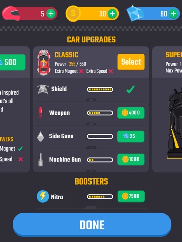 Each car offers a unique driving experience with special features like extra speed or a stronger Shield. The right car can help you make it further.