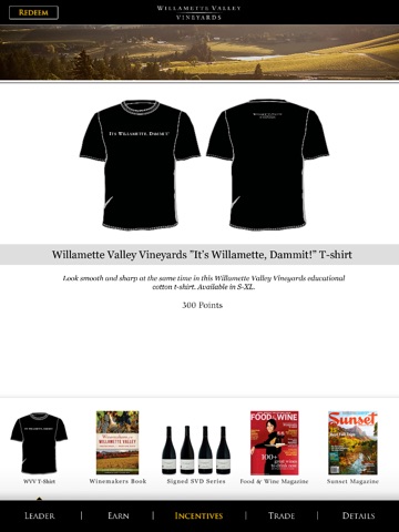 The Willamette Valley Vineyards Rewards App is designed to track sales and outreach activity among our distributors. Quickly sign up and start tracking tasks that help promote the sale of our wines and earn points for your efforts. Then, cash in those points for amazing gifts and rewards.