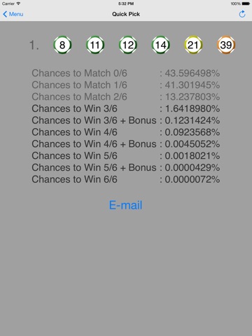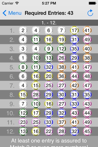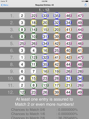 This App is based on sophisticated equations to provide you with just more than 3 hundred combination entries (standard edition only), at least one entry is guaranteed to win at least 3 numbers; 43 entries match at least 2 numbers; 8 entries match at least 1 number and therefore your chances of winning the lottery prizes are significantly increased.