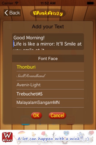 With WinkAway sweep your loved one(s) off their feet with lively/blissful/romantic wishes using Winks (rich and expressive icons with personalized text) irrespective of your texting app..