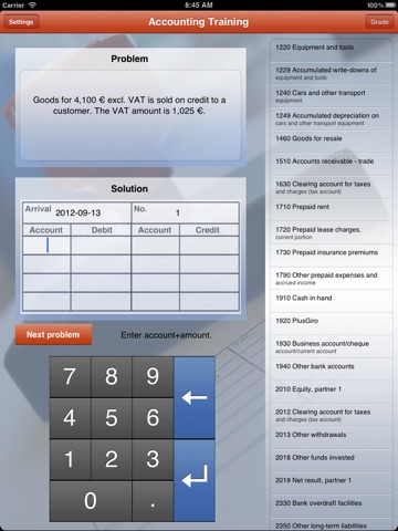 Accounting Training is educational software for training your skill in entering financial events into the books (or accounting software) aimed at courses in accounting. The exercises are randomized within the categories and chapters that you select, with different amounts and rates each time. You can start with the categories that are familiar and select others in the order you want as you or your students progress. This means the app can be adapted to any accounting course. The app also has a diagnostic test where you can discover which categories you have to spend more time on.