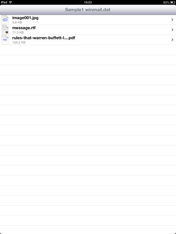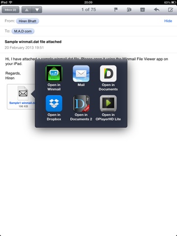 Je ne comprends pas les autres avis très négatifs car sur mon iPad avec iOS 7 cela fonctionne parfaitement. De plus, il est possible, en plus dune visualisation rapide, de renvoyer chacun des fichiers contenus dans le winmail.dat vers lapplication de son choix. Le summum serait bien sûr que le winmail.dat soit directement remplacé par son contenu au sein même du mail, mais je pense que seul Apple pourra le faire un jour avec une mise à jour de lOS.