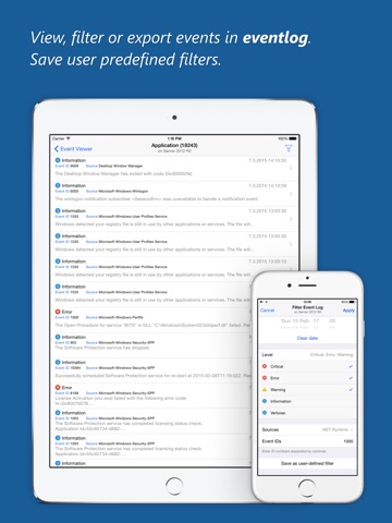 • Filter events by date, level, sources, event ID...