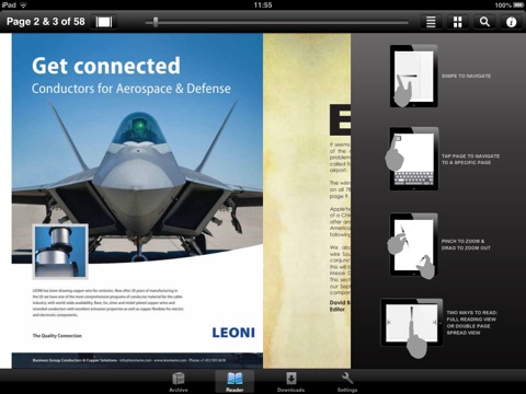 Flip your device and read the magazine as a double-page spread or full screen single page, tap the page selector to choose a specific page to fast-navigate to.