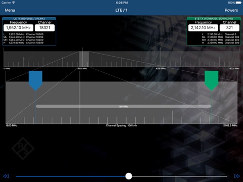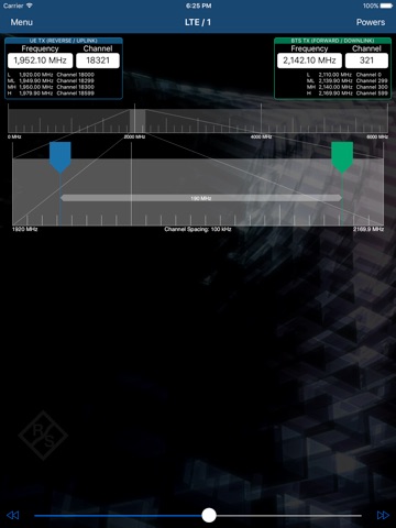 The Rohde & Schwarz Wireless Communications Calculator for iOS is an essential part of any wireless engineers toolkit. Featuring all of todays most important and popular cellular and non-cellular standards, we cover them all from A to Zigbee. Just enter the technology and band of interest, and we do the rest. Enter a channel number and well provide the correct downlink and uplink frequencies in both numeric and graphic format. Low, mid, and high channels are also shown for a quick reference. In the "power" mode, we give you the maximum UE power allowed for that class device, or, in the case of GSM, power versus PCL/Gamma.