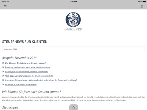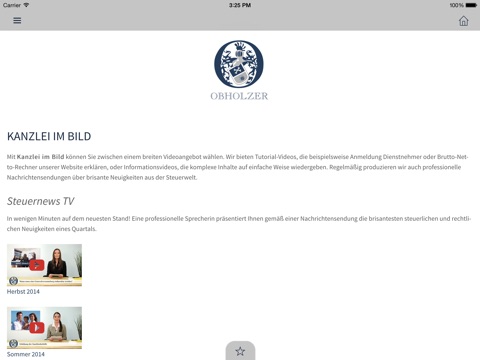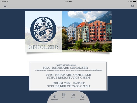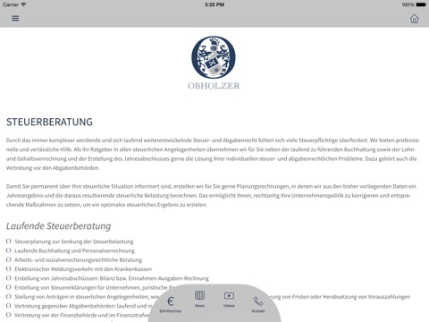 Mit unserer App für iPhone, iPad und iPod touch wollen wir Ihnen die absolute Mobilität bieten. Nach dem Download unserer App stehen Ihnen umfangreiche Informationen und unsere praktischen Onlinerechner auch mobil zur Verfügung. Wir halten Sie über Neuheiten aus unserer Kanzlei und über Steuernews auf dem Laufenden.
