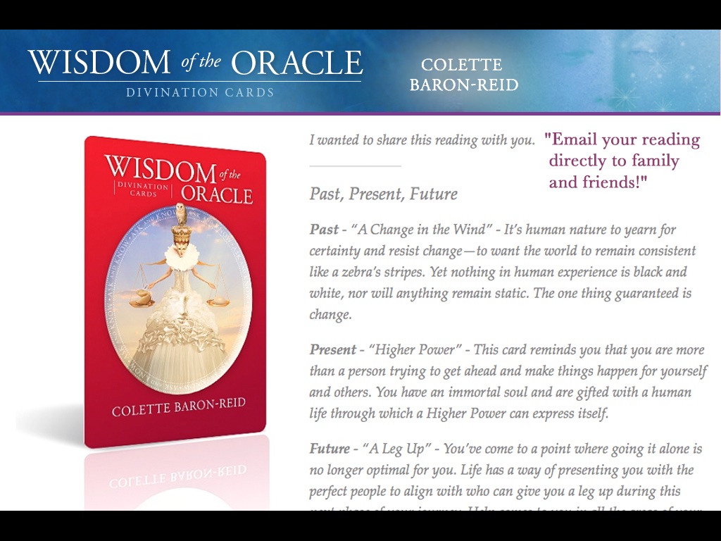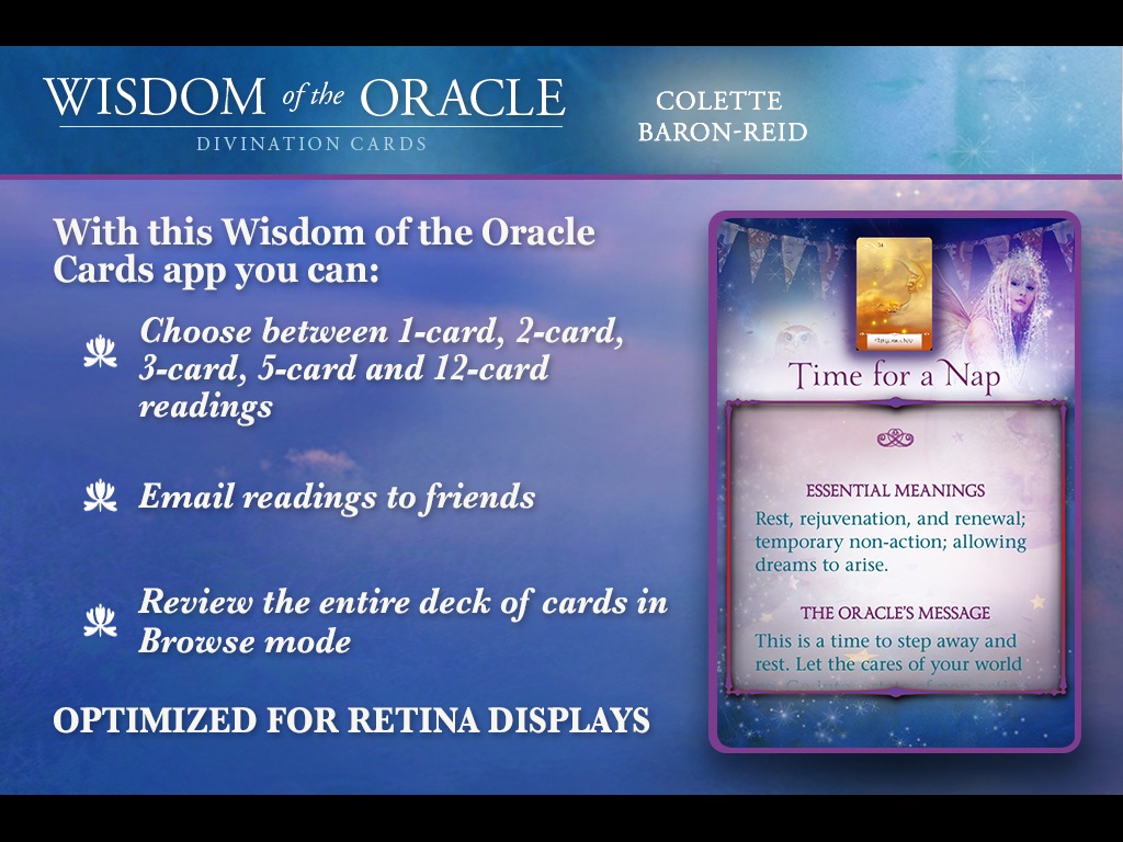 Colette Baron-Reid has expertly blended elements of the I-Ching, Norse runes, traditional tarot, and other ancient divination tools into a sacred communication system: Wisdom of the Oracle. This 52-card app and companion guidebook allows you to interpret messages about all aspects of your journey, with over 250 independent meanings that can speak to an unlimited number of circumstances.