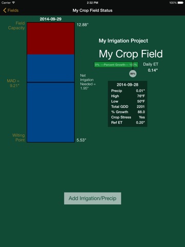 Manage your irrigation schedule while you are standing in your field. This app allows you to enter irrigation, precipitation, and observed soil moisture deficit values remotely to WISE. It also gives you the ability to view your soil moisture profile and check previous weather conditions. To use this app, you must have an eRAMS username and password and already have an irrigation project and field created online.