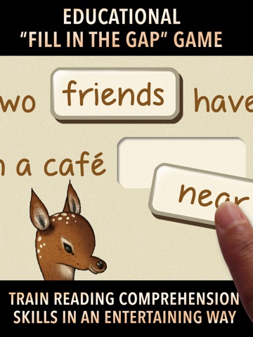 This educational "Fill in the Gap" game trains your English reading comprehension skills. It shows 12 beautifully illustrated scenes with different animals in amusing situations described in witty rhymes. The text contains several blank spaces into which you have to fit the missing words. You can move the words over the screen with your finger and when you tap on the animals you activate a short animated cartoon.