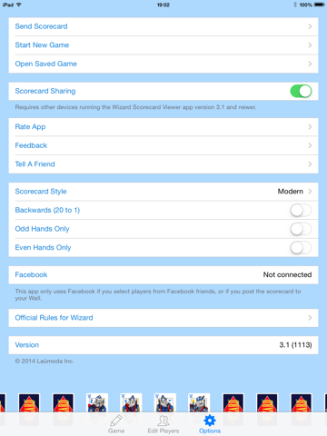 Wizard Scorecard keeps track of scoring in the card game called Wizard®. You enter the bids and tricks taken, and the app will take care of the rest. No more keeping track of score manually! At the end of the game, you can share the completed scorecard on Facebook, Twitter or email. Select players from Contacts, or previous players. Handles multiple Bid Variations, including Hidden Bids.