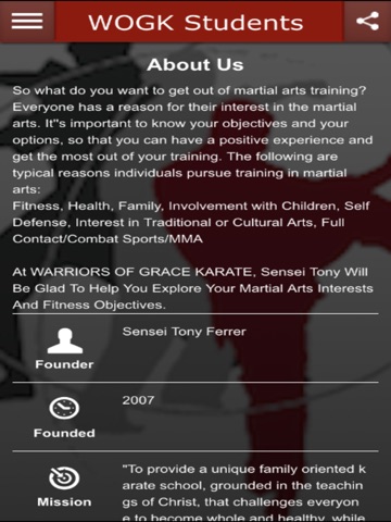 Warriors of Grace Karate, located in Severn MD, is pleased to offer the all new students mobile app. This app will allow students to stay connected to the dojo and to complete class sign in registration.