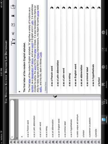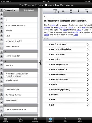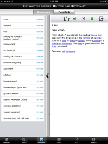 A law dictionary for today’s reader. Download the free version of the Wolters Kluwer Bouvier Law Dictionary app and get access to all A terms in the dictionary. Upgrade to the full version and get access to over 11,000 words and phrases. The app allows you to look up terms instantly using the search feature; take notes on individual terms; bookmark relevant terms and use the flashcard view to help with test prep; share terms, definitions, and audio files via email Facebook, and Twitter; take advantage of the 1,500+ pronunciation files; etc.