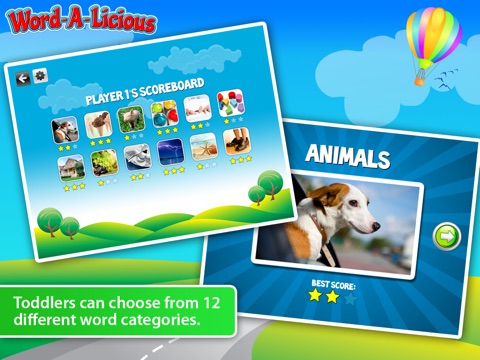 Kids can choose to play a game from among twelve different word categories. At each stage, the child is presented with four flashcard images and a word, and is encouraged by the narrator to select a correct answer. You also have the option of displaying two flashcard images at a time for simpler game play. Whether the childs answer is correct or not, the narrator expresses appreciation for the childs response. Stars are awarded to the child at the end of each game to reward their achievements. Save scores on up to 4 unique players.