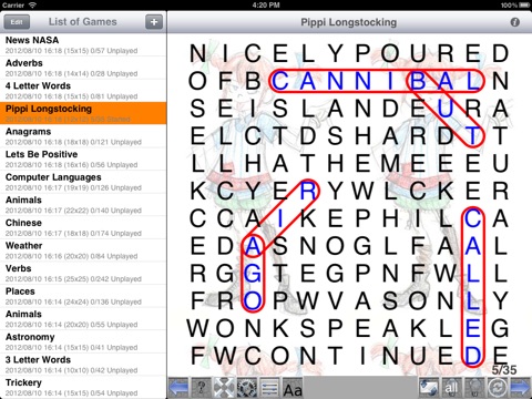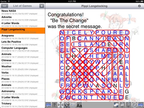 Pros: large or small word sets Remaining letters make a message Build your own puzzles - sort of* Multiple puzzle sizes Multiple zoom / font option Cons: The game will not let me drag to select words, tap only Marking found-words blue fails if you switch between games Right swipe is odd, brings up menu instead of previously viewed screen. But you tap through pages. Odd. Menu should be tap. The game tells you the final message without giving you any time to read it out for yourself Some word lists embed new words within other words - ex: the solution location for "ate" is within "rated". One is ok, but 10 in a puzzle isnt. * When I created a puzzle with a list of human needs, the builder added its own words like cup, fear, boy, drop, dry, and, and dirt. It did not use most of my words. Ok game but disappointing and needs improvement...