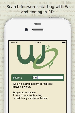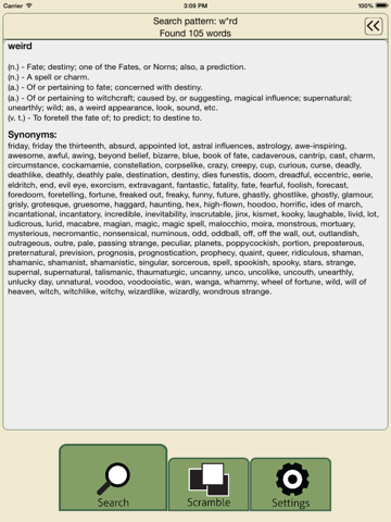 The purpose of this app is to help you find words based on a pattern or spelling by using "wildcard" characters. With over 300,000 words and names, many of which with off-line definitions, synonyms, and antonyms, this app can be used as an off-line dictionary too. For example: