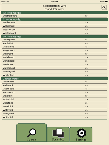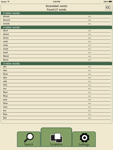 This app is not meant to be a cheating tool while playing scrabble style word games, but it could be useful when playing such games too. Open the Scramble screen and search for words that contain some or all of the letters you need to build a word with. When wild card ("?") characters are used only words containing all specified letters will be produced. Specifying a larger number of letters will increase search time.