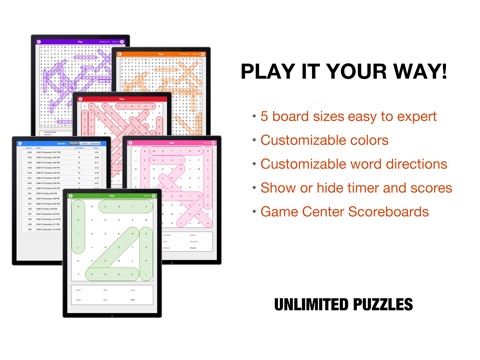 A delightful and simple way to play this classic. Play it your way. Customize the size of the board, the direction (across, down, diagonal, reversed) of the words, the color theme, and show or hide the score and timer. You can play an easy 6 by 6 letter board or ramp all the way up to a 24 by 24 board. Both kids and experts can play. Oh yeah, there are an unlimited number of puzzles to play! Try it, youre going to like it!