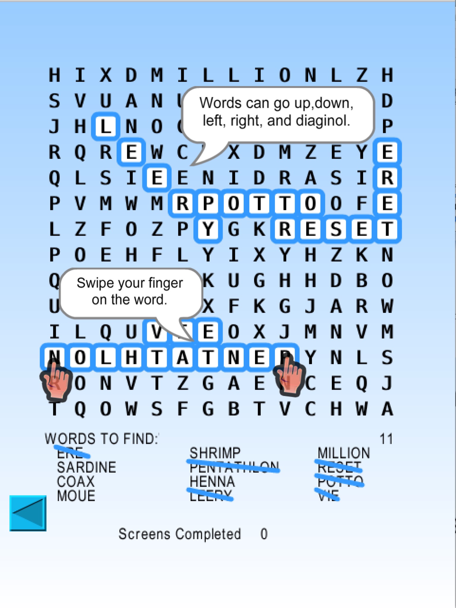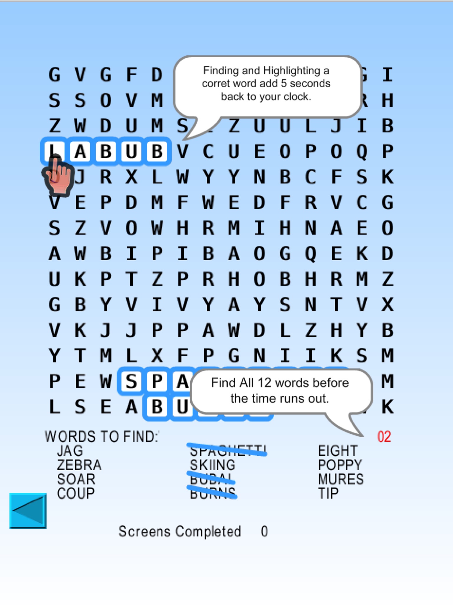 The game is certainly very hard, and will challenge the player every time they play. Gameplay is simple, simply reference the term in the wordlist, find it hidden in the puzzle, and highlight by holding your finger on the start letter and dragging it to the end of the word. Continue this until the time runs out or the play has finished the puzzle.