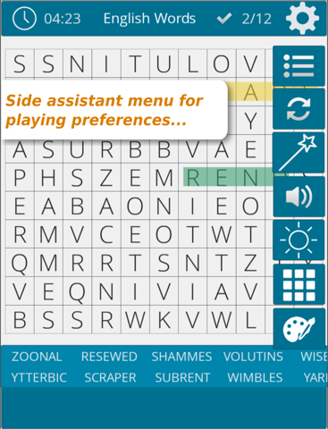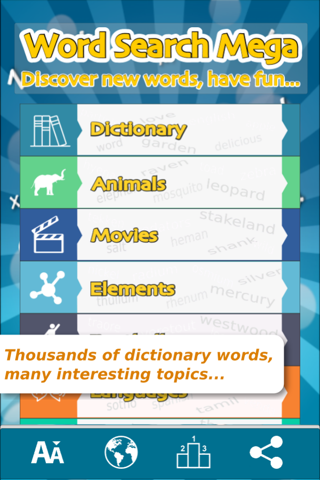 Find out the words in the grid on any direction including diagonals... Dont lost in many screens, with one click you are ready to go !