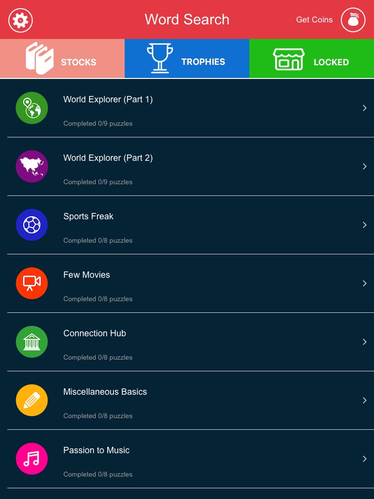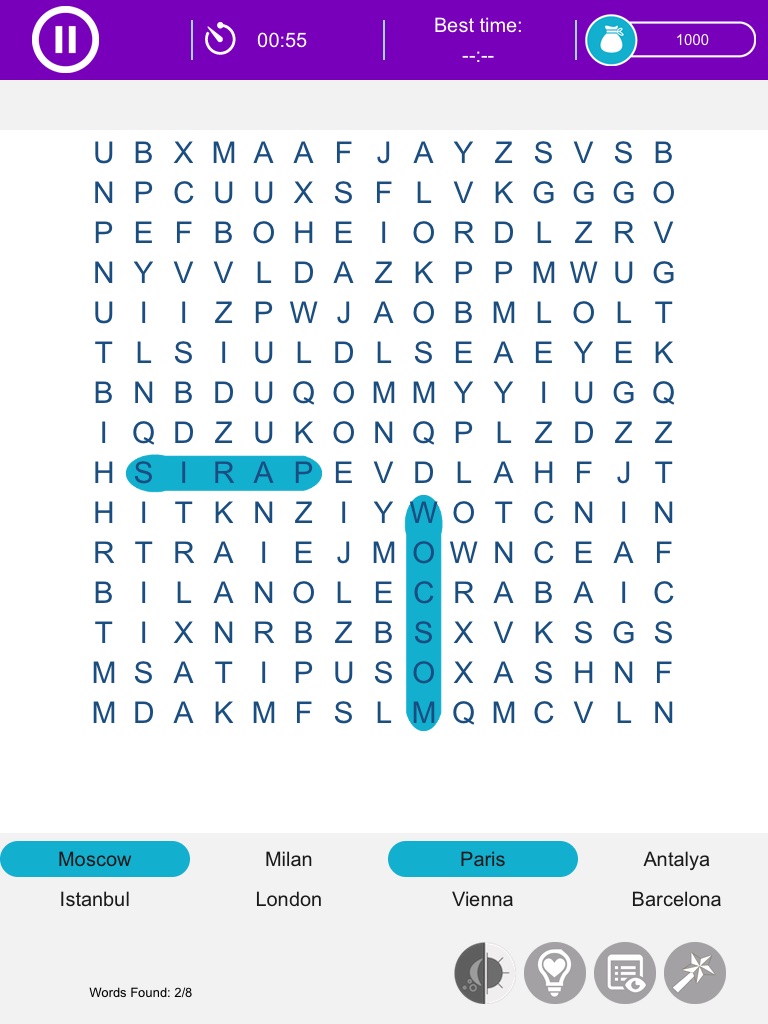 Just choose your word search category and try to find secret words in game area; time is counting and your word search score will depend on your time spent. Succeed on given targets to achieve virtual trophies.