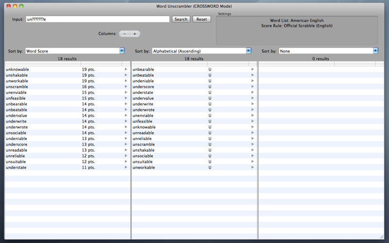 Quickly solve anagram, word scramble/jumble or crossword puzzles! This utility can be used with games such as Sċrabble or Words with Friends. Simply select the type of puzzle you need assistance with (anagram/word scramble, or crossword) from the app preferences and the app will process the input letters accordingly.